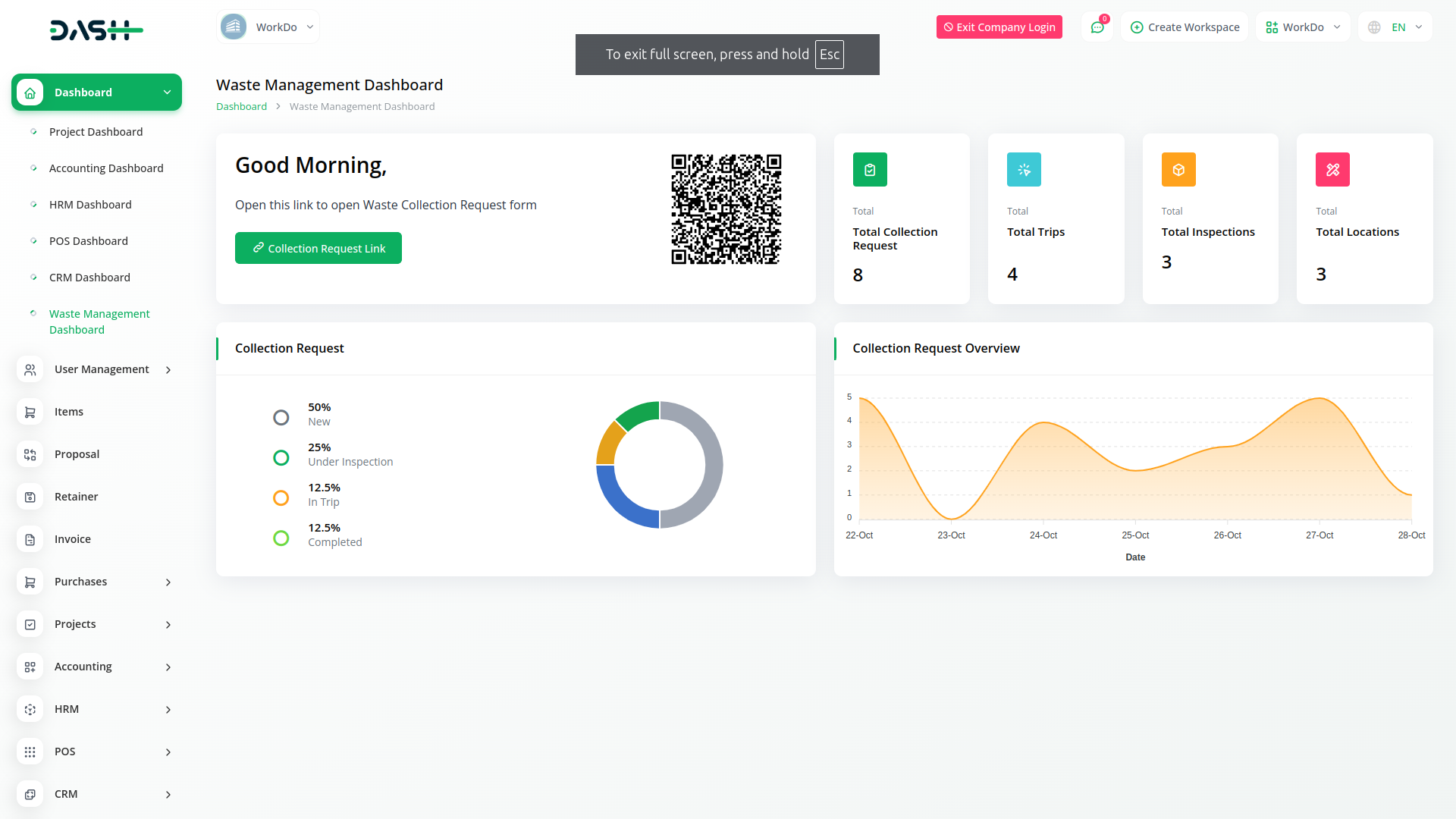 Visualize data trends with charts depicting collection request statuses, trip progress, and inspection outcomes, Analyze waste management metrics to identify areas for improvement and optimization.